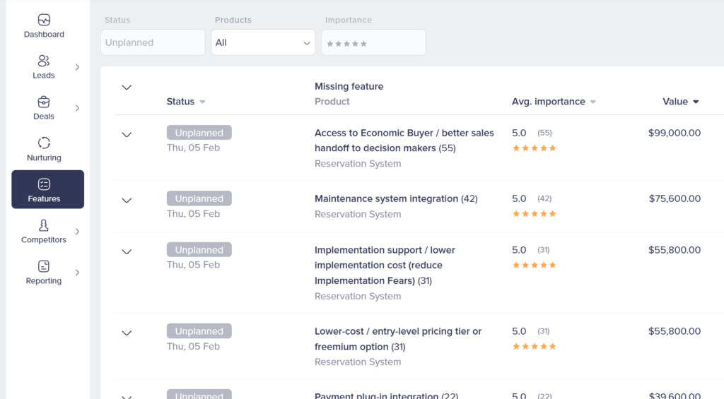Over time, you build a list of features with real revenue impact attached. You can see which missing features have cost you the most in lost deal value. This is powerful data for product roadmap discussions – instead of guessing what to build, you have actual numbers showing what prospects are willing to pay for.