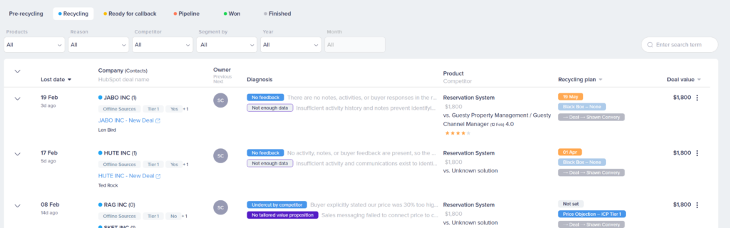 If auto-recycle is turned off, new lost deals land here first. You can browse the list, filter by product or time period, and decide which deals are worth tracking. If auto-recycle is on, you won’t see much in this list since deals get imported automatically.