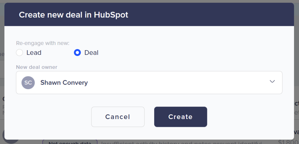 Re-engagement is what happens when you decide it’s time to follow up with a recycled deal. In Rizer, this means creating a new deal or lead in HubSpot.