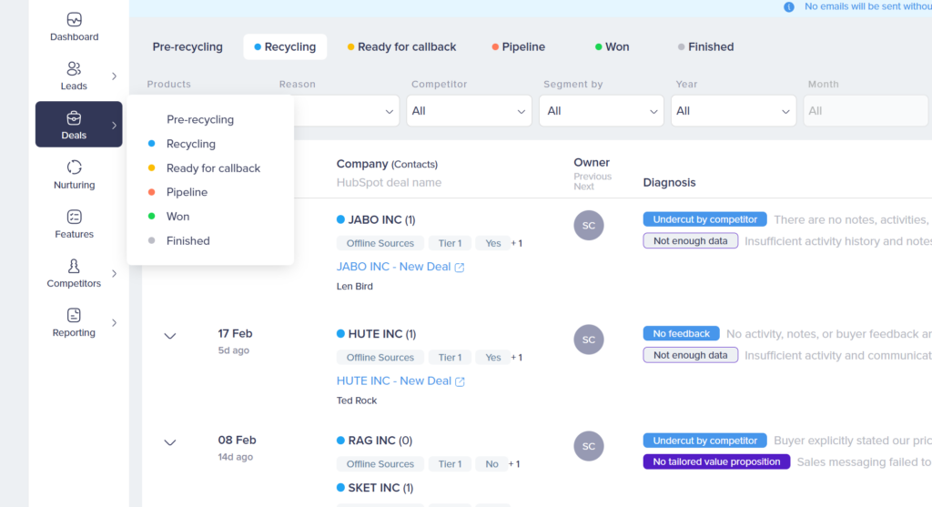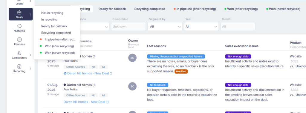 Every deal you recycle gets tracked with two key pieces of information: why it was lost and when you should follow up. You can see at a glance how many deals are sitting in recycling, which ones are ready for a callback right now, and which ones you’ve already won back.