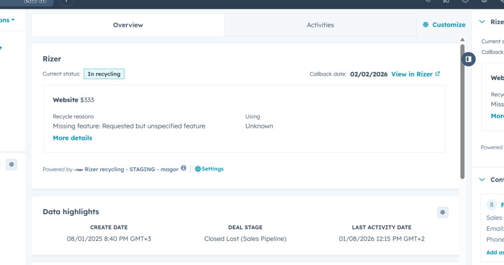 Rizer Recycling is a HubSpot add-on that helps sales teams win back lost deals. Instead of letting closed-lost opportunities fade into your CRM history, Rizer keeps track of them and tells you when it’s time to reach out again.