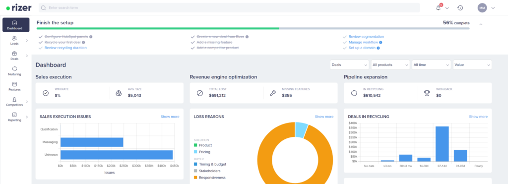 It doesn’t manage your active pipeline. Rizer focuses on lost opportunities. Your open deals and closed-won deals are outside its scope. Your team keeps using HubSpot for everyday pipeline management.