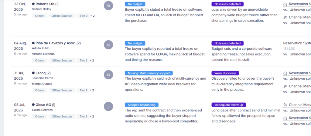 The AI also spots sales execution issues – things that might have gone wrong in your process. Maybe there was a long gap between the demo and the follow-up, or multiple stakeholders were involved but only one was really engaged. This kind of insight helps your team improve, not just recover lost revenue.