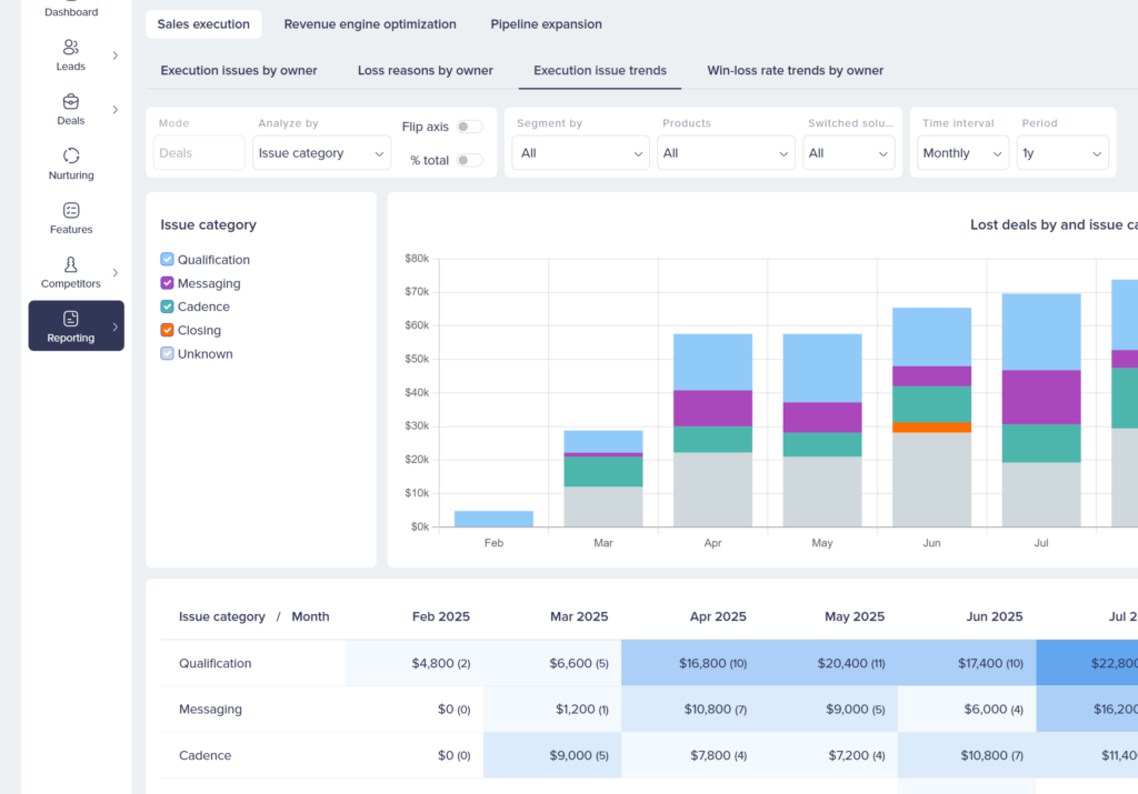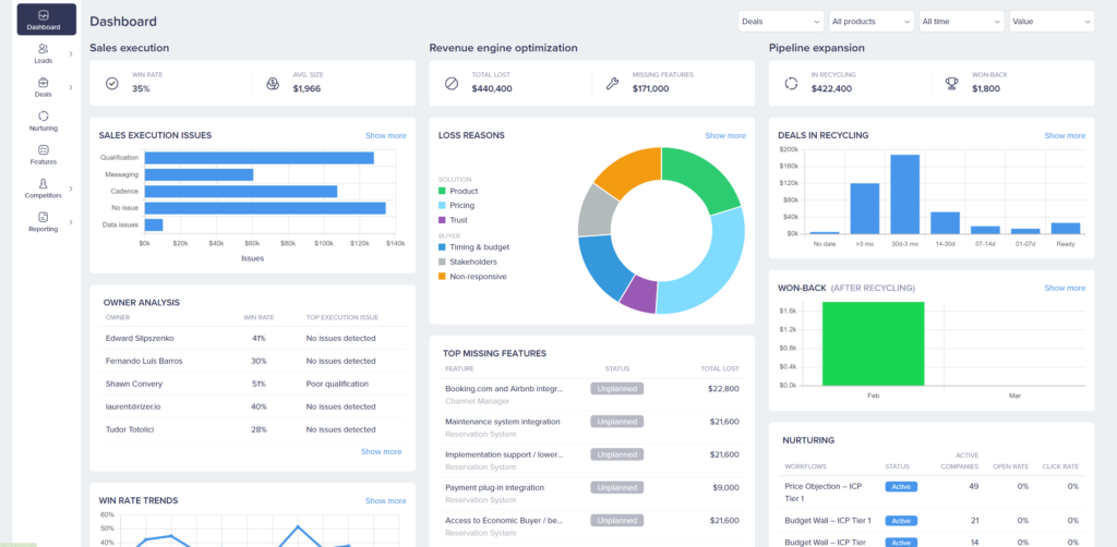 The reports help you understand patterns – which competitors are winning, which missing features are costing the most revenue, and which recycle reasons have the best recovery rates.