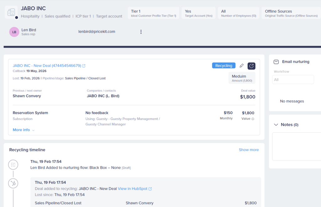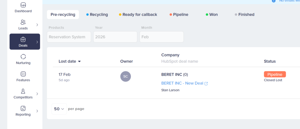 With auto-recycle off, lost deals from HubSpot land in the Pre-recycling tab. They wait there for someone to review them and decide whether they’re worth tracking.