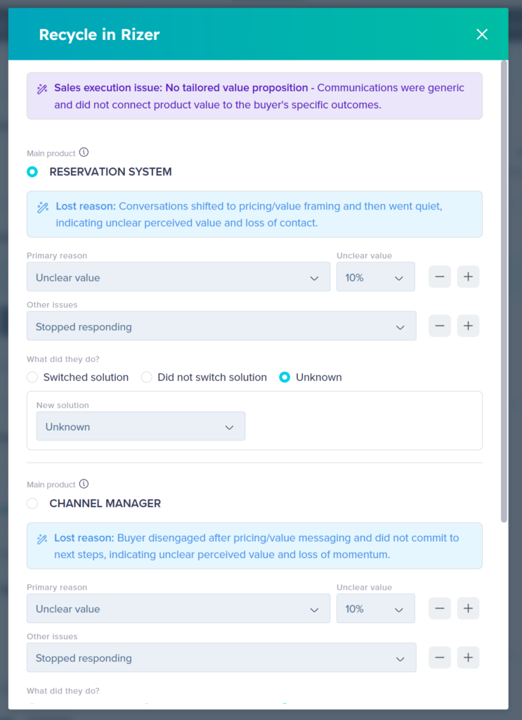 The AI analyzes deal notes and history to suggest a reason. It’s often right, but not always. If you know something the AI doesn’t — maybe you had a conversation that wasn’t logged — override the suggestion.