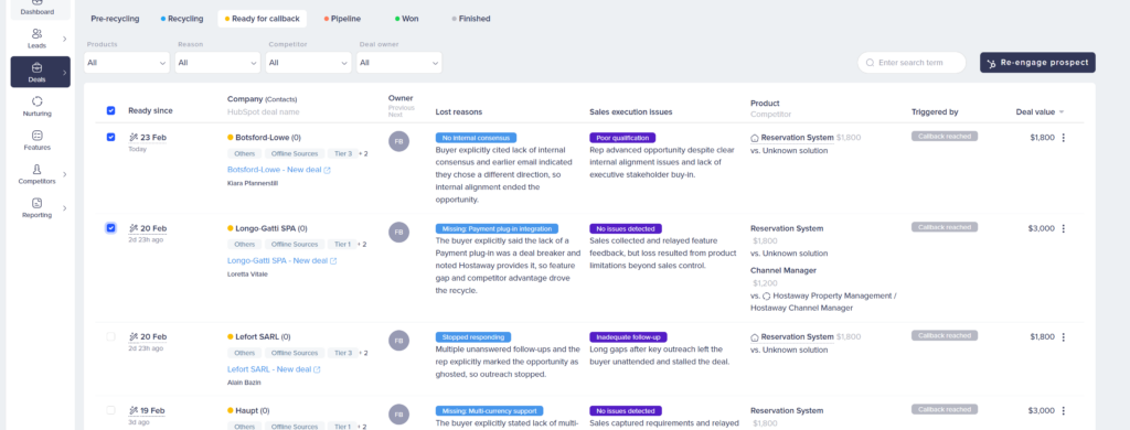 When deals hit Ready for callback, act on them. Review, decide, and either re-engage or mark completed. Letting deals pile up in the ready queue defeats the purpose — you’re back to lost deals sitting unworked.