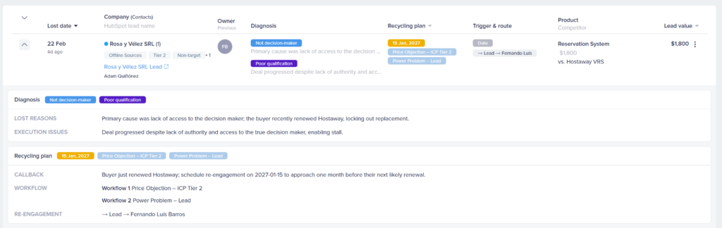 The list columns also give you a quick overview without expanding: Diagnosis shows the loss reason tags, Recycling plan shows the callback date and assigned workflows, and Trigger & route shows what will move the lead forward and where it will go.