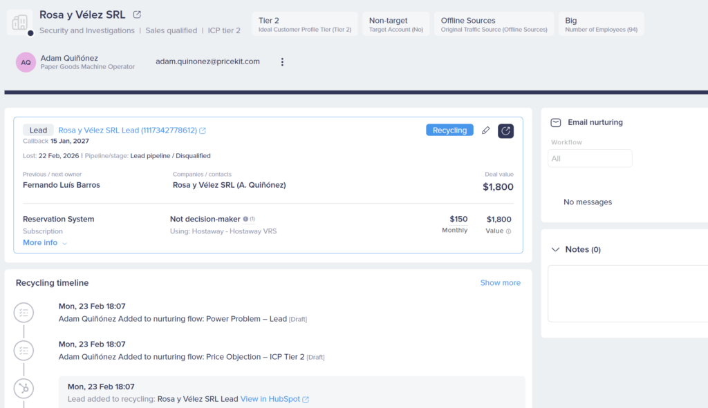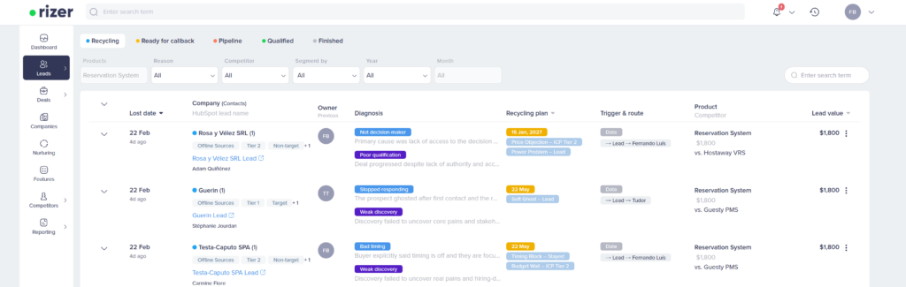 Rizer supports recycling HubSpot leads in addition to deals. If your sales process uses leads — contacts that need qualification before becoming deals — you can track and re-engage them through the same recycling system.