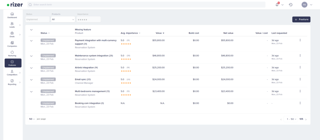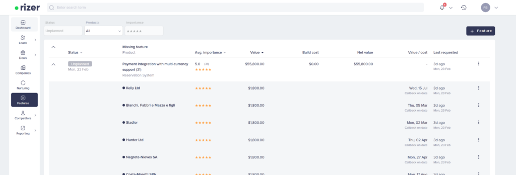 Here’s where missing feature tracking really shines: when a feature is implemented, Rizer automatically moves affected deals to Ready for callback.