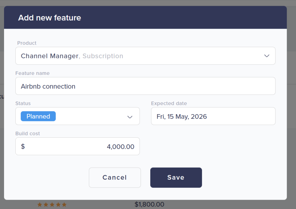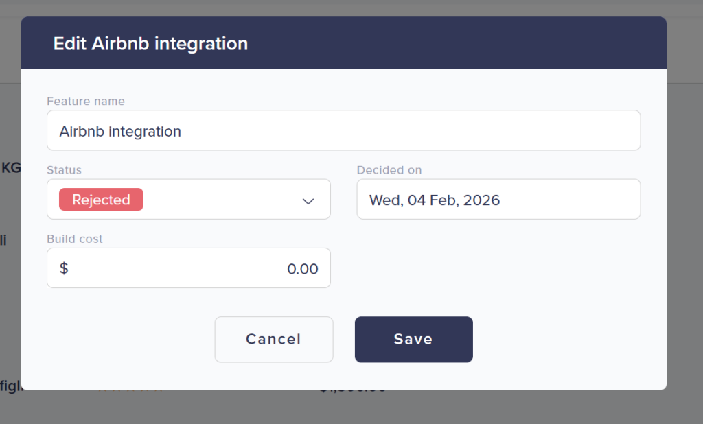 • Build cost — Your estimated cost to build this feature. This enables ROI calculations. Enter in your default currency.