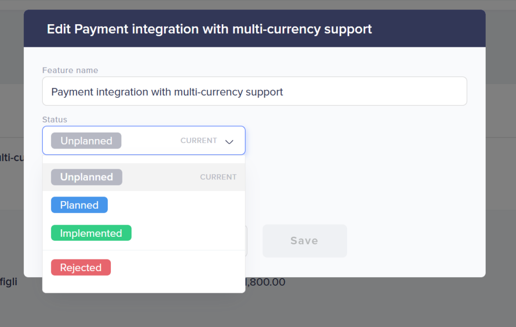 • Status — Current development status of the feature (Unplanned, Planned, Implemented, Rejected).